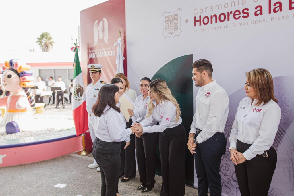 En su mensaje la Presidenta de DIF Matamoros, Ana Ariceaga de Granados, expresó: “Esta ceremonia cívica es aún más significativa hacerlo junto a este gran equipo del DIF Matamoros, porque sé que cada uno de ustedes entrega su corazón en cada tarea, en cada servicio y en cada sonrisa que logran crear en las personas que más lo necesitan. Gracias por su dedicación, por su entrega y por hacer de este organismo un espacio de esperanza y transformación”.