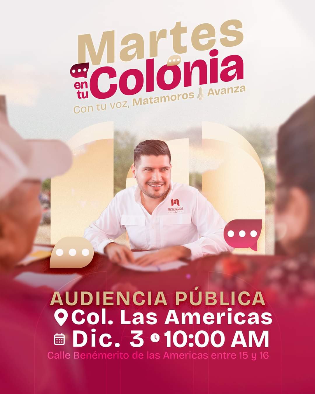 Matamoros, Tamaulipas. Este martes 3 de diciembre, el programa municipal “Martes en tu Colonia” llegará a la colonia Las Américas, donde diversas áreas del Ayuntamiento, junto con la Junta de Aguas y Drenaje, estarán ofreciendo atención personalizada a los vecinos de la zona.