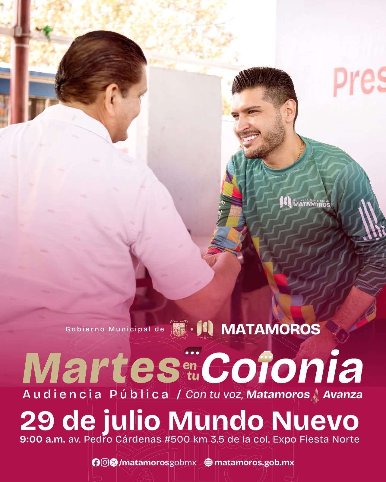 H. Matamoros, Tamaulipas.- El Gobierno de Beto Granados, comprometido con la cercanía, el diálogo y la atención directa, invita a la población a participar en una nueva edición del programa “Martes en tu colonia”, que este 29 de julio tiene como sede el Centro de Convenciones Mundo Nuevo. Será a partir de las 9:00 de la mañana.