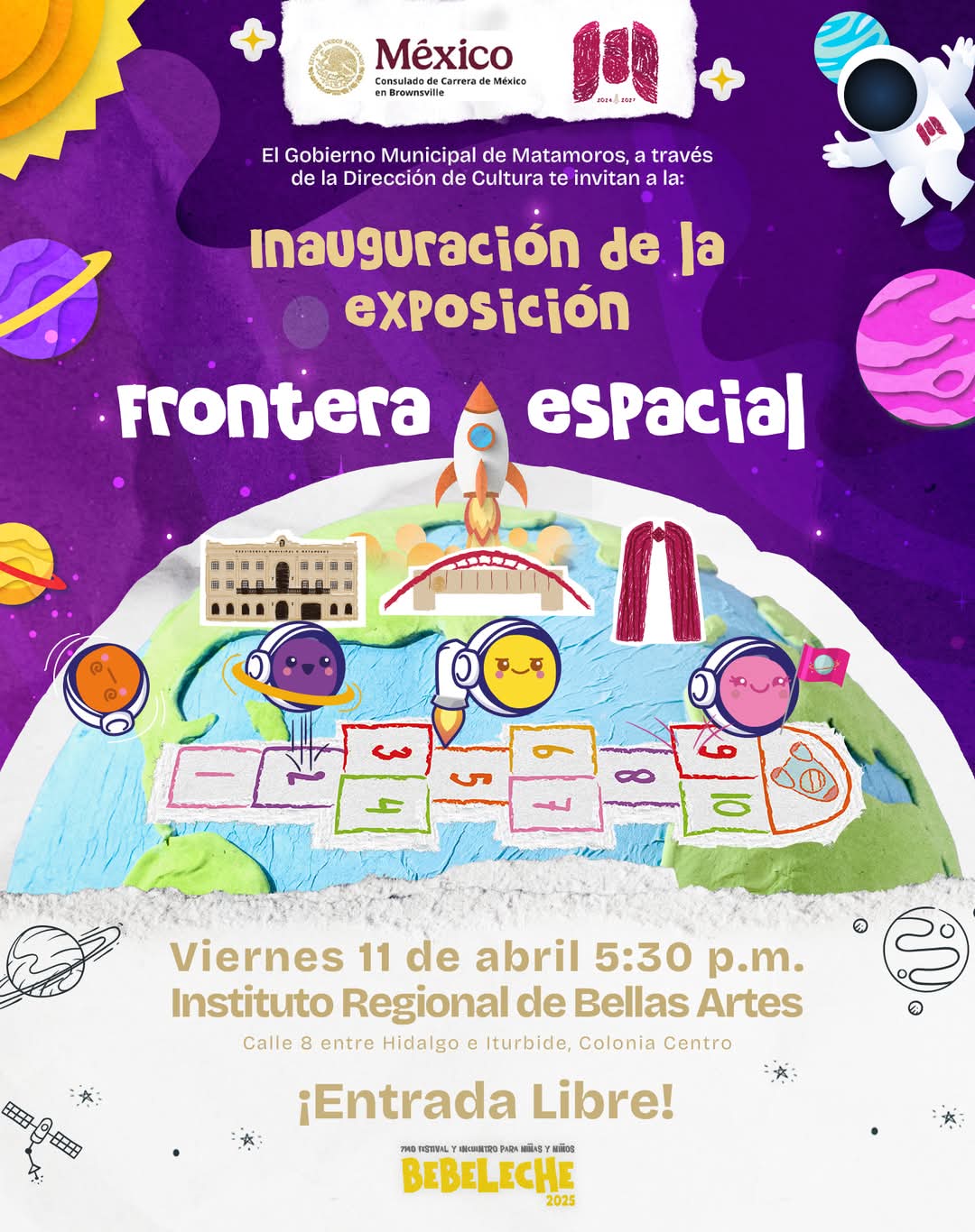 H. Matamoros, Tamaulipas.- “Frontera Espacial” llega este viernes 11 de abril al Instituto Regional de Bellas Artes. Lo anterior en el marco del 7o. Festival y encuentro para niñas y niños, bebeleche 2025.