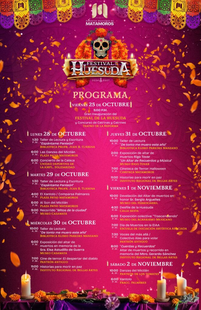 Con un programa que abarca 24 actividades en diversos puntos de Matamoros, el Festival de la Huesuda no solo busca promover la cultura, sino también integrar a toda la comunidad. Los eventos se llevarán a cabo en unidades deportivas, recintos culturales, panteones, plazas comerciales y en las principales calles del centro histórico, garantizando una celebración diversa y accesible para todos.