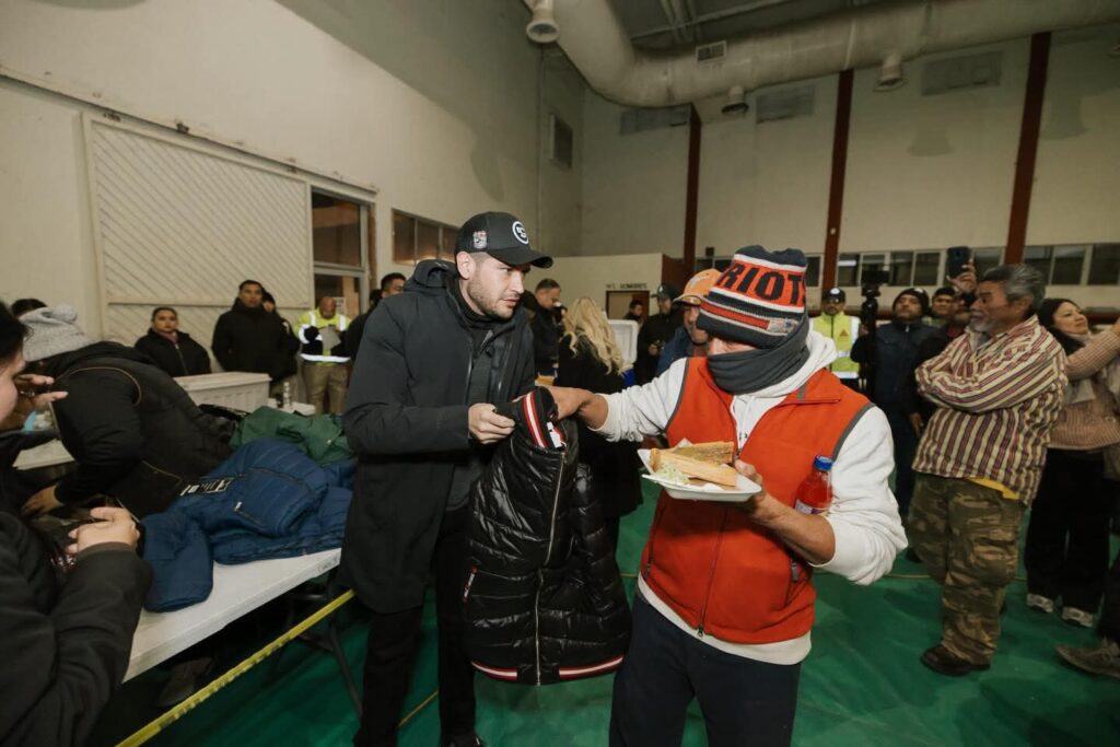H. Matamoros, Tamaulipas.- Acompañado por la presidenta del Sistema DIF Matamoros, Anita Granados, el presidente municipal, Beto Granados, acudió al albergue Alberca Chávez para brindar apoyo a las personas resguardadas ante las bajas temperaturas, entregando alimentos calientes, chamarras y cobijas y algunos otros artículos para el frío a quienes más lo necesitan; señaló que este albergue permanecerá abierto todo el tiempo que sea necesario.
