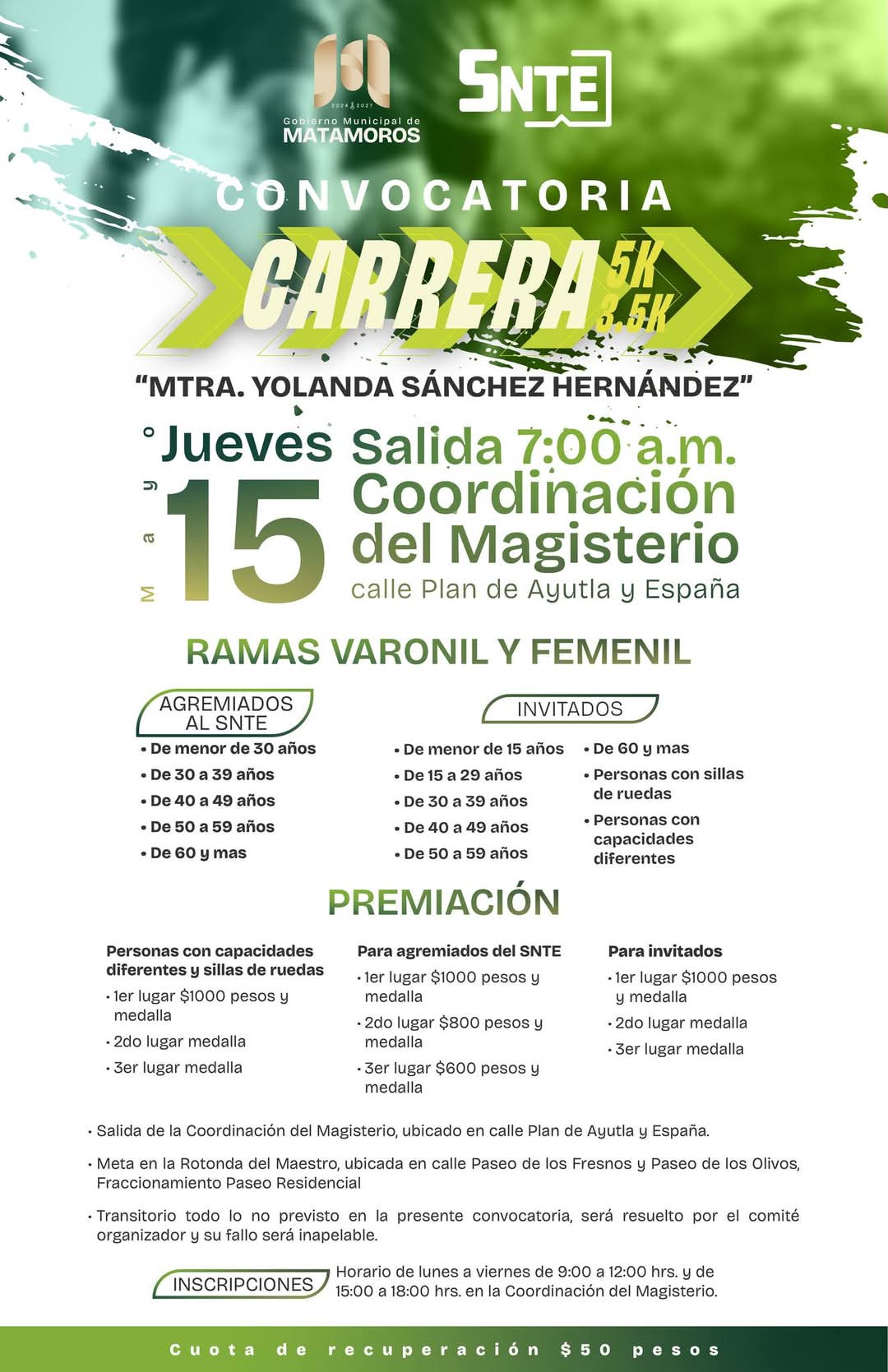 H. Matamoros, Tamaulipas.- El Gobierno Municipal de Matamoros, en coordinación con el sector educativo, invita cordialmente a participar en la carrera 3.5-5K “Maestra Yolanda Sánchez Hernández”.