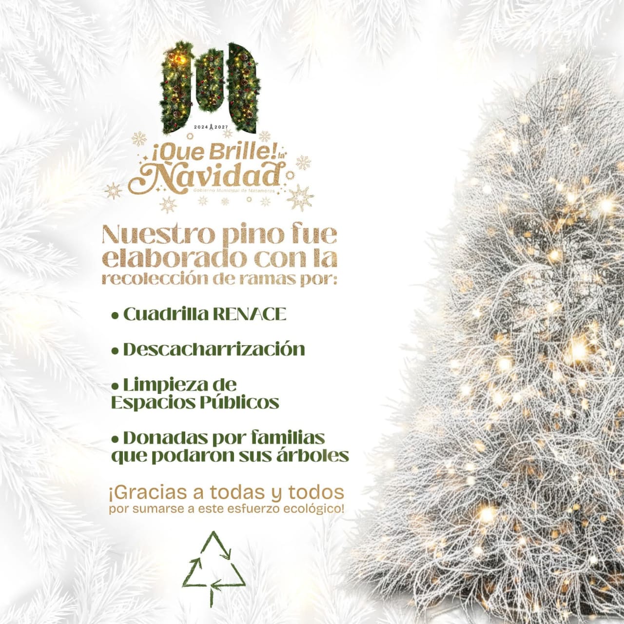 El pino fue elaborado a partir de ramas recolectadas por cuadrillas de limpieza, campañas de descacharrización y familias que realizaron la poda de sus árboles, sumándose a un esfuerzo colectivo para celebrar una Navidad sustentable y responsable, para que brille Matamoros.