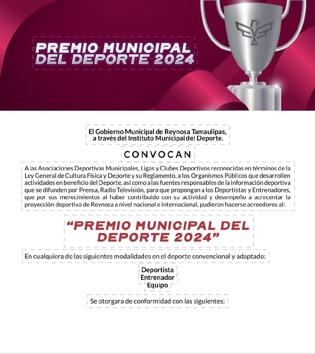 El Gobierno Municipal de Reynosa, encabezado por el Alcalde Carlos Peña Ortiz, da a conocer la apertura de las convocatorias para el Premio Municipal del Deporte 2024, en reconocimiento a los deportistas, entrenadores y equipos más destacados, así como para el Premio al Periodismo Deportivo 2024, que celebra el trabajo de los comunicadores especializados en el ámbito deportivo.