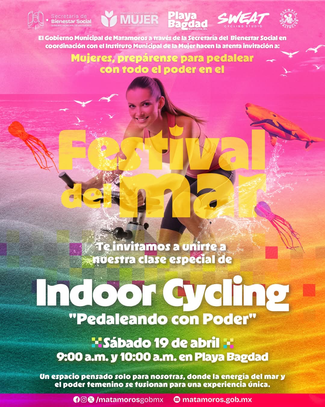 H. Matamoros, Tamaulipas. – El Gobierno Municipal de Matamoros, a través de la Secretaría de Bienestar Social y en coordinación con el Instituto Municipal de la Mujer, invitan cordialmente a todas las mujeres de nuestra comunidad a ser parte de una experiencia única y llena de energía en el marco del Festival del Mar 2025: la clase especial de Indoor Cycling “Pedaleando con Poder”.