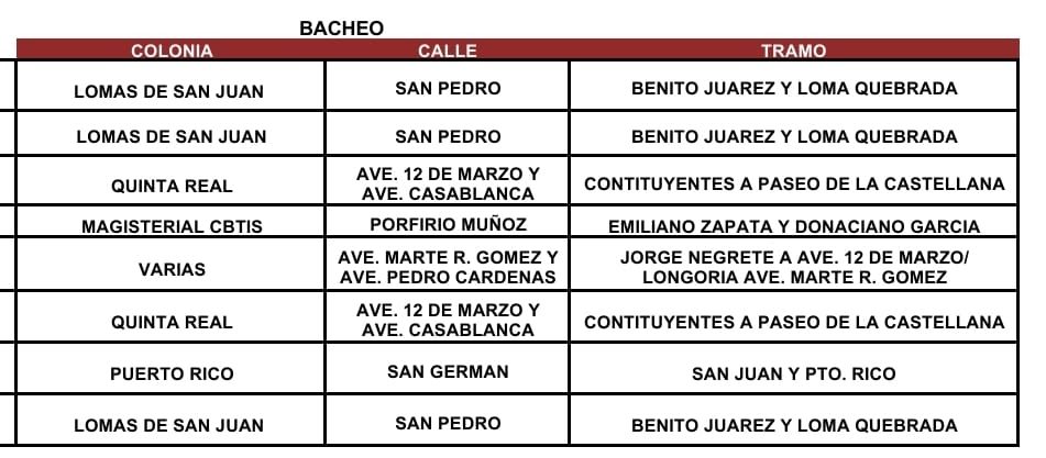Programa Permanente de Bacheo en Matamoros 11 septiembre, 202510 septiembre, 2025 por Alicia Rodriguez Este miércoles 10 de septiembre el Gobierno de Beto Granados continúa trabajando para acabar con los baches que gobiernos pasados heredaron. Si sabes de alguna calle que requiera mantenimiento, repórtala en Rigo: https://matamoros.gob.mx/rigo Conduce con precaución en las zonas de reparación