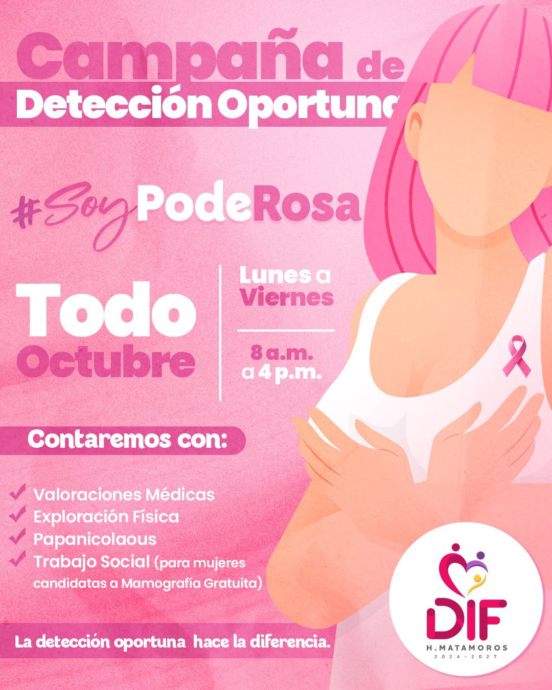 Durante el mes de octubre a través del área de Salud de este organismo, se llevará a cabo la Campaña “Soy PodeRosa” en donde se ofrecerá Valoraciones Médicas, Exploración Física y Trabajo Social, para mujeres candidatas a recibir una Mamografía Gratuita, herramienta fundamental en la detección temprana del cáncer de mama.