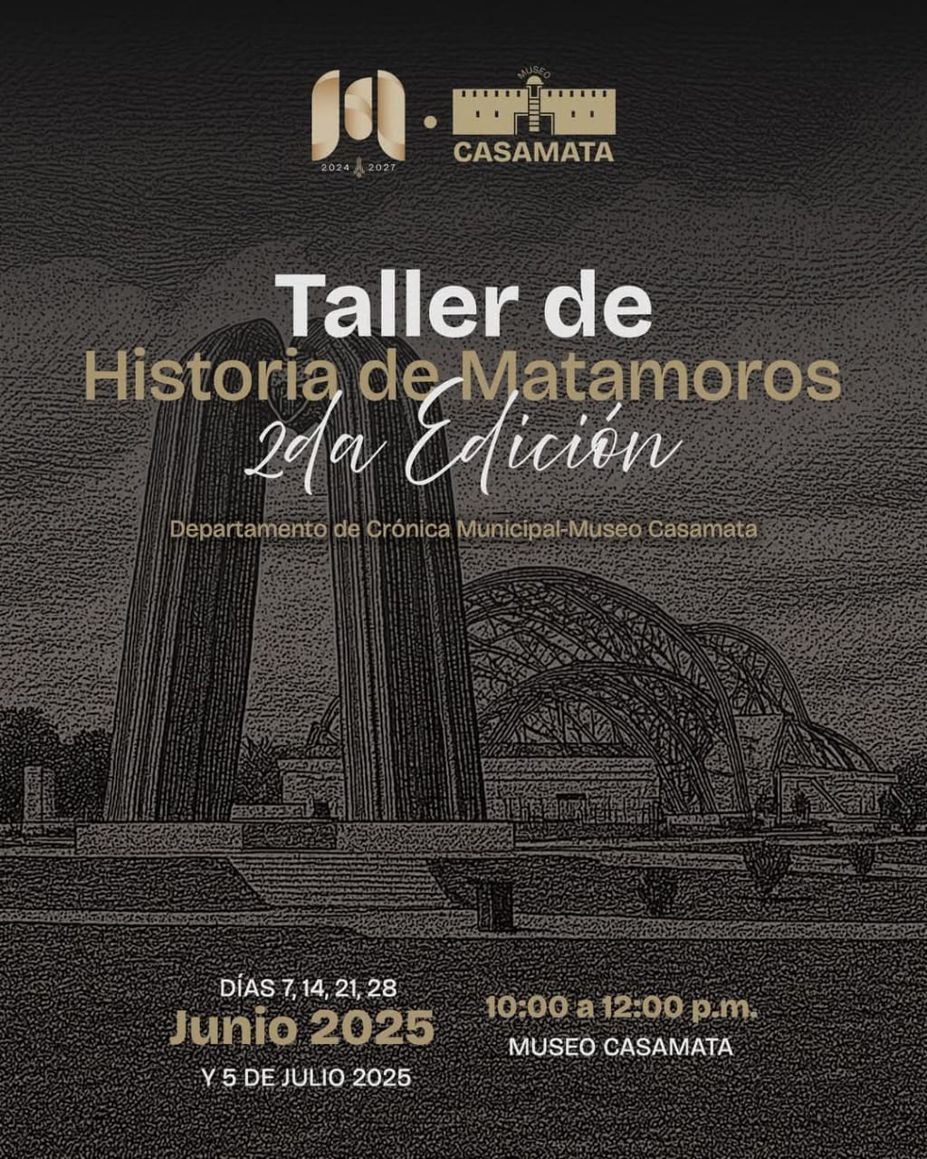 H. Matamoros, Tamaulipas.- Con el objetivo de fortalecer el conocimiento sobre nuestra identidad local y rescatar la memoria histórica de nuestra comunidad, el Gobierno Municipal de Matamoros, a través del departamento de crónica municipal y el museo Casamata, invita a la ciudadanía a participar en la segunda edición del Taller de Historia de Matamoros.