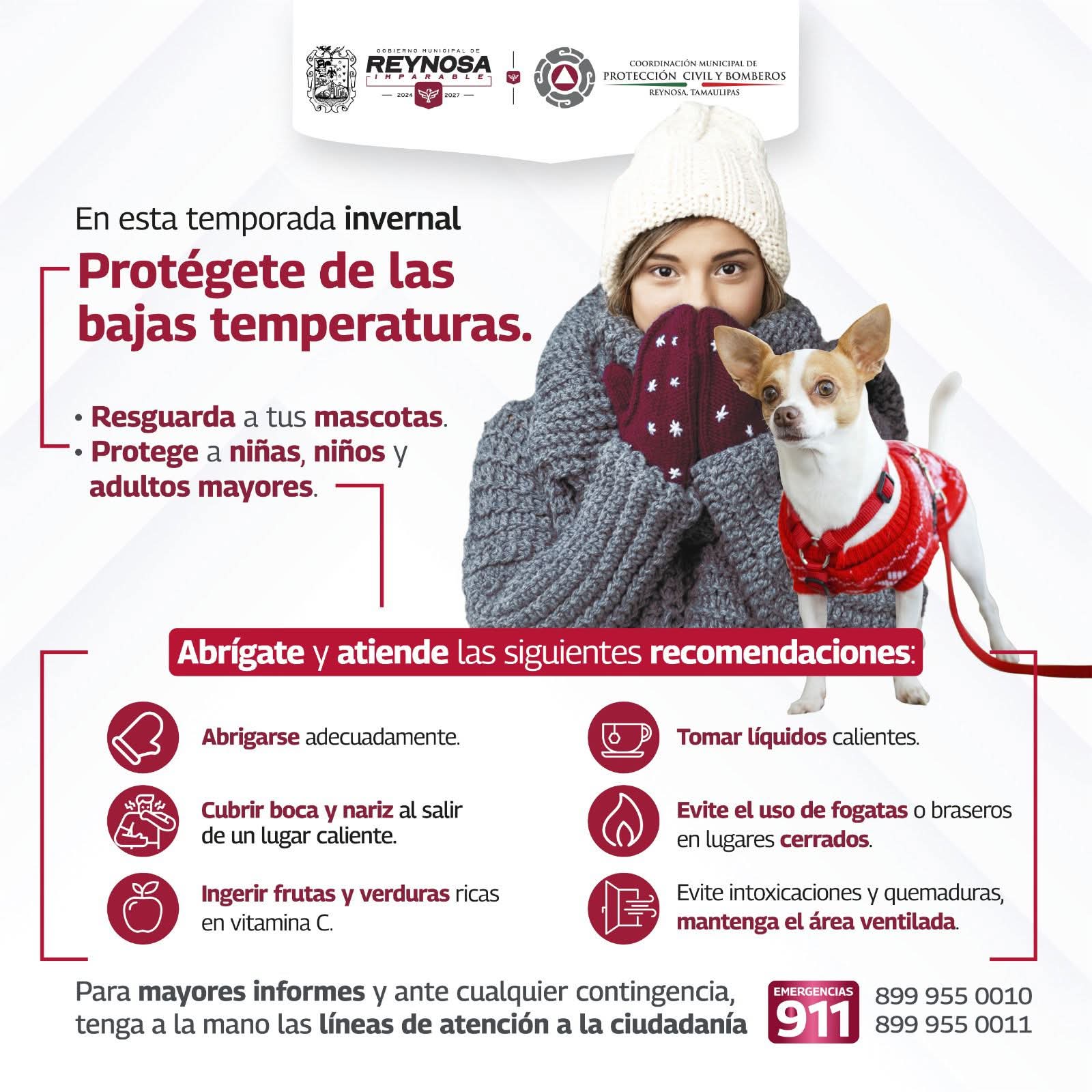 El Gobierno Municipal de Reynosa hace un llamado a la población para extremar precauciones ante las bajas temperaturas que afectan la región. Según el Servicio Meteorológico Nacional y organismos especializados en el clima, la noche del domingo 25 de enero se registrarán temperaturas entre 2° y 3° C.