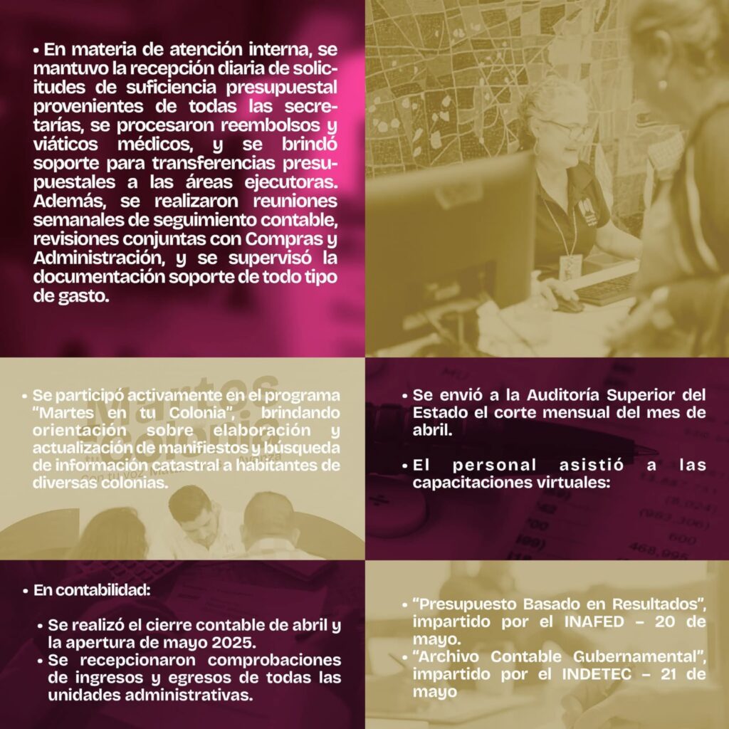 A través del programa Martes en tu Colonia, el gobierno municipal brindó atención directa a los contribuyentes, facilitando trámites catastrales en diferentes zonas de Matamoros. Asimismo, la participación activa en auditorías, reuniones interinstitucionales, procesos contables y capacitaciones fortaleció la planeación y el control financiero del Ayuntamiento.