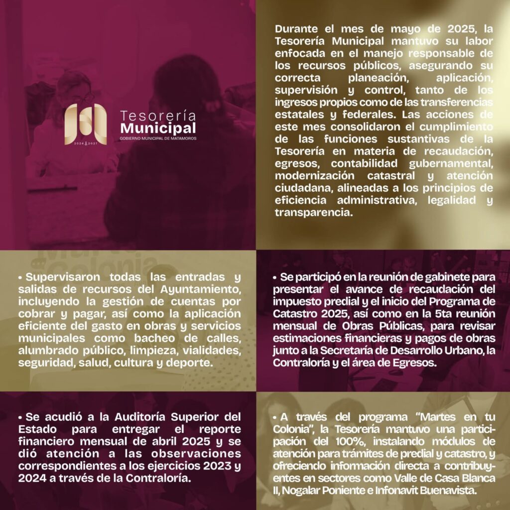 H. Matamoros, Tamaulipas.- Durante el mes de mayo, la Tesorería del Gobierno Municipal de Matamoros reiteró su compromiso con una gestión financiera responsable, asegurando que cada ingreso y egreso del Ayuntamiento se lleve a cabo con total transparencia. Esta labor reafirma la confianza ciudadana en una administración que vela por el correcto uso de los recursos públicos.