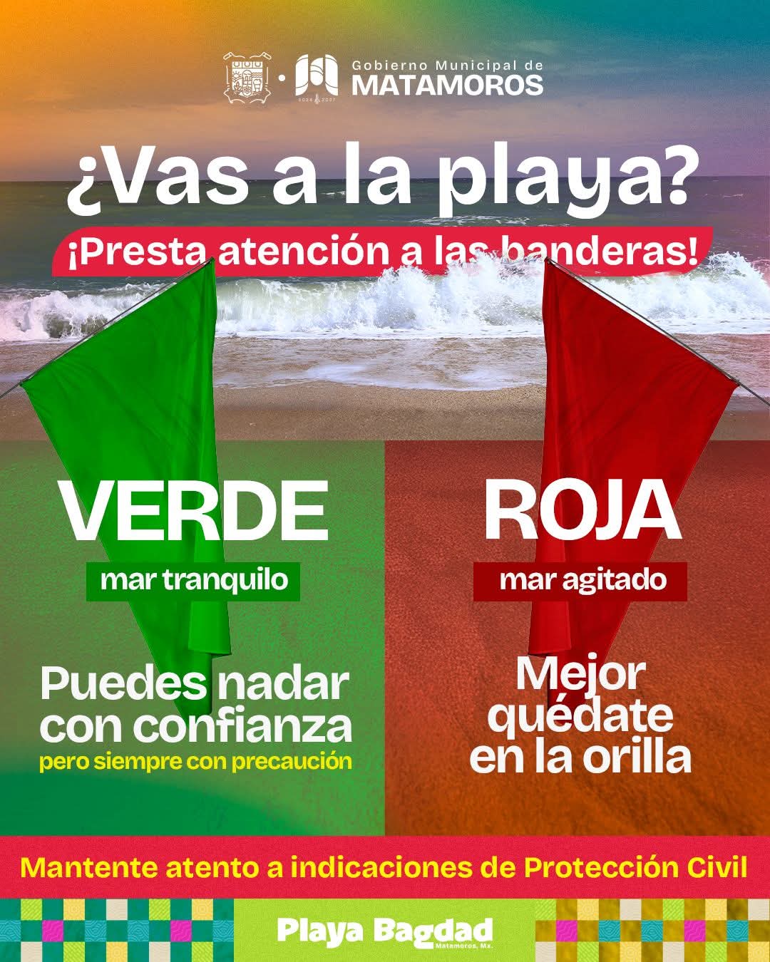 H. Matamoros, Tamaulipas.- Con el objetivo de salvaguardar la integridad de las familias matamorenses y de los turistas que acuden a Playa Bagdad, el Gobierno Municipal de Matamoros exhorta a la población a mantenerse informada y atenta a las señales que se colocan en la zona costera, especialmente las banderas de advertencia que indican las condiciones del mar.