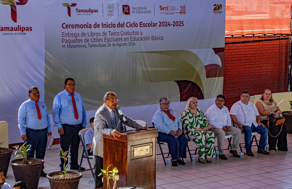 El Presidente Municipal de Matamoros, Dr. Rubén Sauceda Lumbreras encabezó este lunes las ceremonias de inicio de ciclo escolar 2024-2025 en la primaria María Isabel Mata Alvarado y en el Instituto Tecnológico de Matamoros, en tanto que en la primaria Adalberto J. Arguelles acompañó a Adriana Lozano, quien con la representación del gobernador Américo Villarreal Anaya activó el inicio de clases en esta frontera.