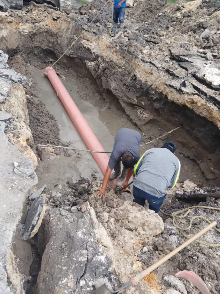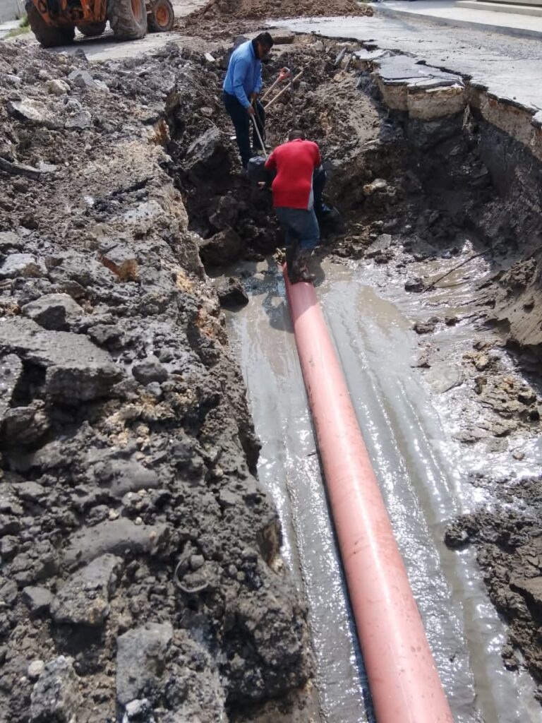Las labores se están llevando a cabo en el cruce de las calles Lábaro Patrio y 18 de Julio, donde se realiza la sustitución de la antigua red por nueva tubería de PVC con un diámetro de 12 pulgadas. Esta acción tiene como objetivo mejorar la infraestructura sanitaria de la zona, permitiendo una mayor capacidad y eficiencia en la conducción de aguas residuales.