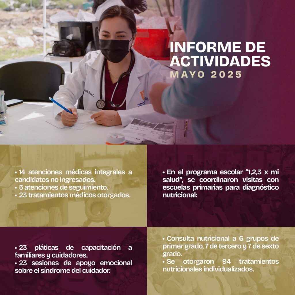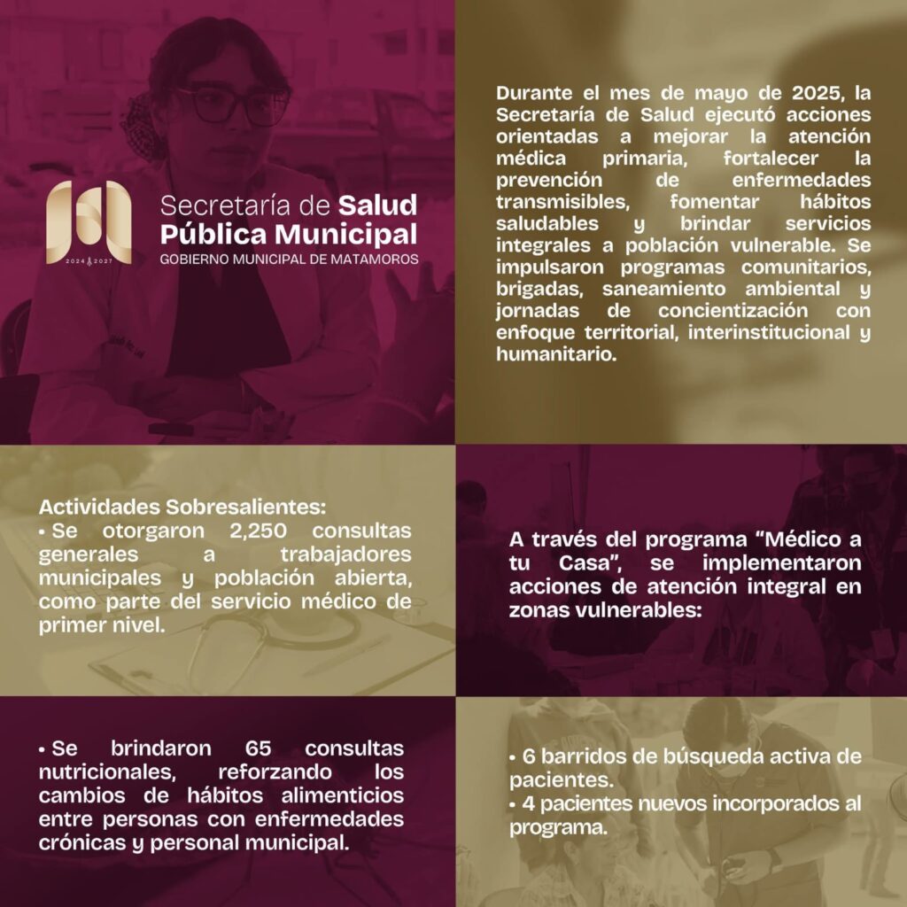 H. Matamoros, Tamaulipas.- Durante el mes de mayo, el Gobierno Municipal de Matamoros, a través de la Secretaría de Salud Pública Municipal, reforzó significativamente su labor en materia de atención médica, prevención y promoción de la salud, en beneficio de miles de matamorenses. Estas acciones forman parte del compromiso por mejorar la calidad de vida de la población y consolidar el Renacimiento de Matamoros.