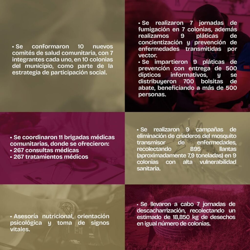 En este periodo, se otorgaron más de 2,200 consultas generales y se fortalecieron programas clave como Médico a tu Casa y 1,2,3 x mi salud, con una orientación especial hacia zonas vulnerables y planteles de educación básica. Asimismo, se realizaron brigadas médicas, campañas de fumigación, pláticas de concientización y jornadas de descacharrización, contribuyendo activamente a la prevención de enfermedades transmitidas por vector.