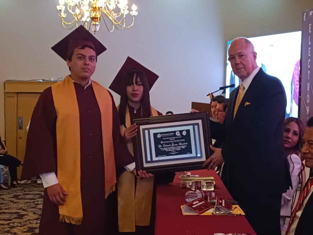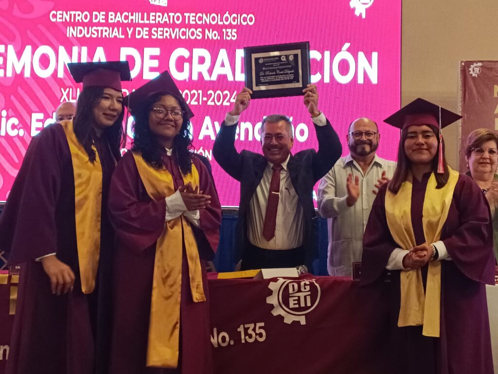 La generación de estudiantes hizo entrega de un reconocimiento al padrino de la generación, Licenciado Eduardo García Avendaño, así como al director del Cbtis 135, maestro Rolando Cortés Delgado.