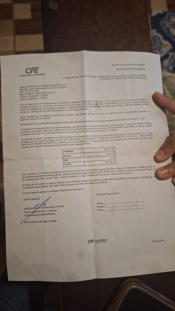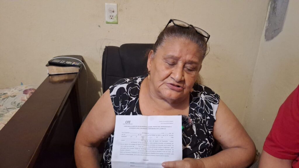 Resulta que los trabajadores de la CFE le están cargando a su cuenta cinco años de “supuesto” robo de la energía, ya que, en el 2019, la señora María Ventura consumía entre 1,800 y 2,500 pesos de energía, pero en esas fechas aún vivía con ella uno de sus hijos con su familia. Una vez que su hijo, su nuera y sus cinco nietos dejaron la casa, el monto a pagar a la CFE disminuyó en un 70 por ciento, debido a que ya se quedó sola.