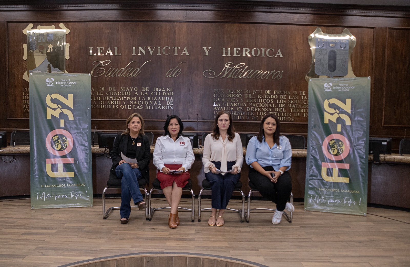 Cynthia Alejandra López Tapia, presidenta del Patronato del Festival Internacional de Otoño (FIO), acompañada de autoridades municipales como la secretaria de Educación, Cultura y Deporte, Yolanda Chavira Estrada, Sandra Luz García Guajardo, directora de Cultura y Alba Viridiana Villasana Aguilar, regidora presidenta de la Comisión de Cultura y Deporte, dio a conocer los detalles de este gran festival que cumple 32 años de brindar espacios artísticos para las familias de la ciudad.